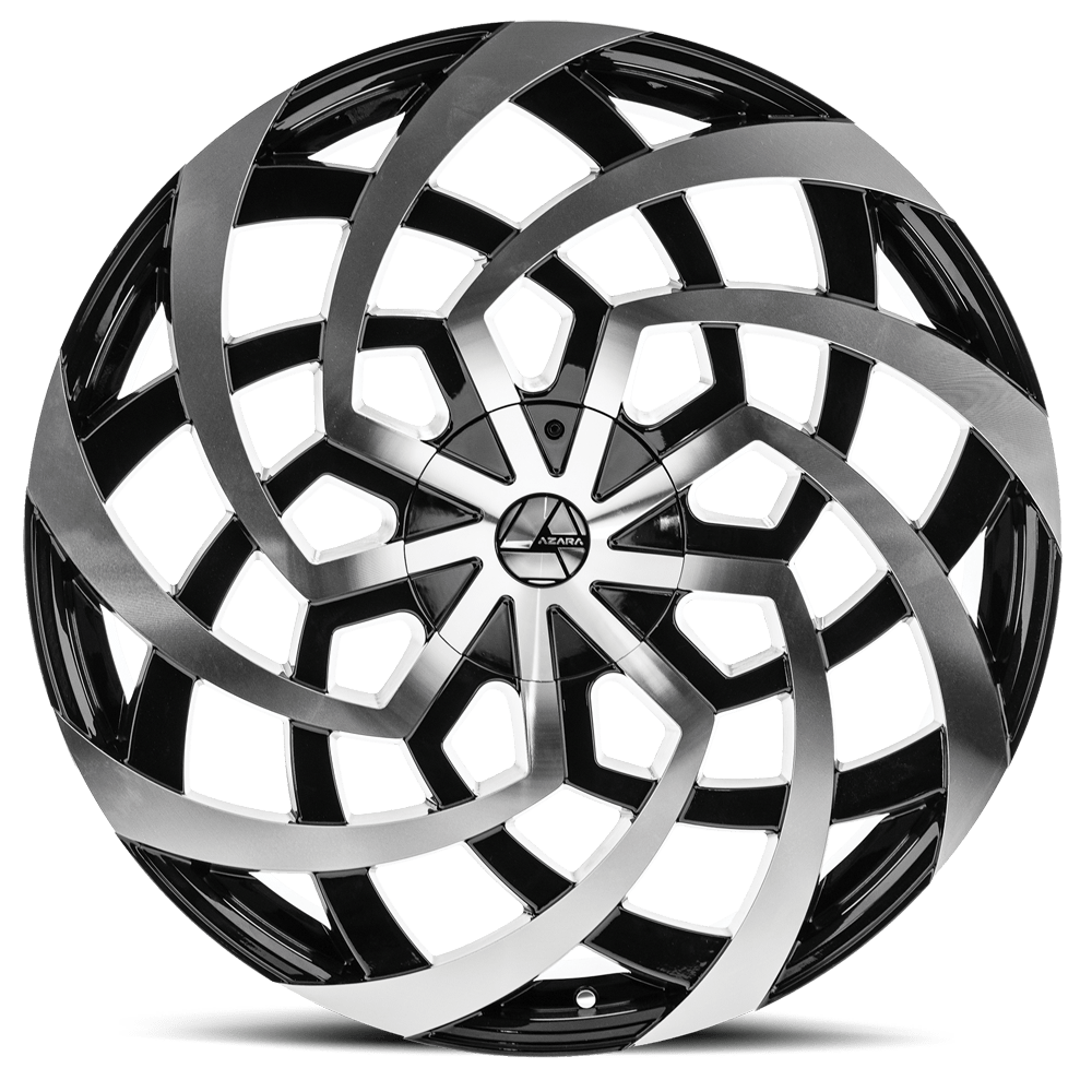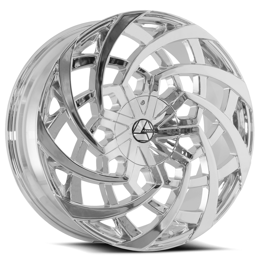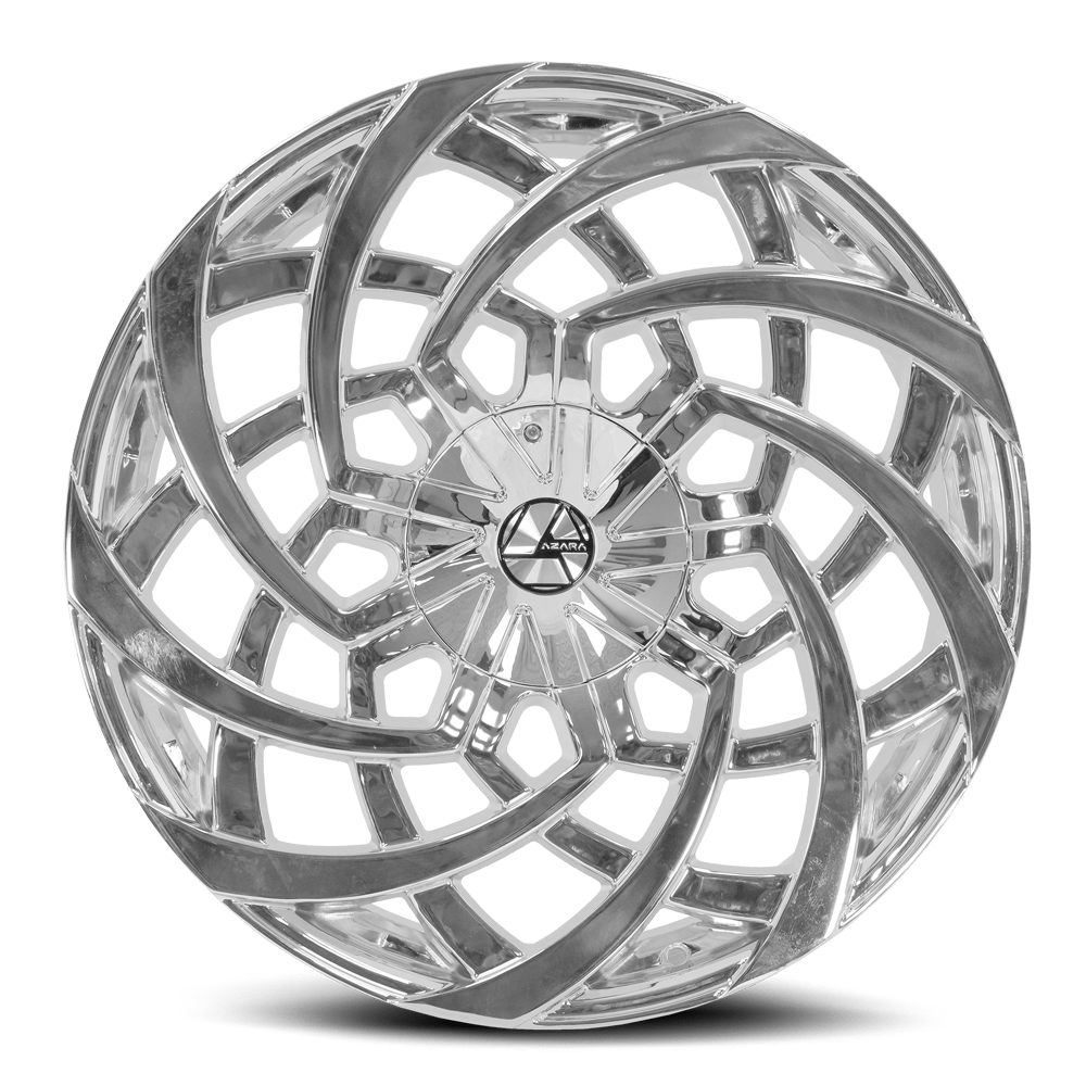The AZA-521 stands out with a full-face, multi-spoke style featuring a twist. The spokes extend to the lip, while another set runs in the opposite direction, giving a unique appearance when rolling. This design comes in gloss black machined or chrome, with sizes from 20×8.5 to 30×9.5.