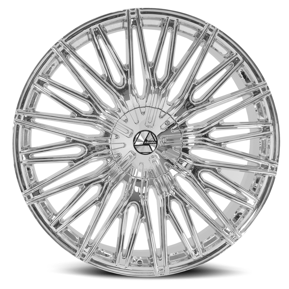 The AZA-522 presents an asymmetrical, multi-spoke style with the spokes extending to the lip. This aftermarket wheel design, available in gloss black machined or chrome, offers sizes from 20×8.5 to 24×9.